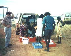 Books being unpacked from a car parked on the beach by Indigenous women and children, and one non-Indigenous man. CD label reads : "NTOM Flying Bibleman"