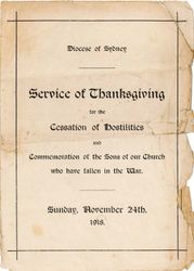 Church of Australia - Diocese of Sydney, A. (1918). Service of Thanksgiving, 1918. Retrieved from the Atla Digital Library, https://archives.moore.edu.au/documents/detail/6607.
