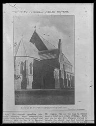 St Paul's Cathedral, Rockhampton. Photograph of page from St Paul's Cathedral Jubilee Souvenir, showing photograph of the exterior at the east end. Digitised from a quarter-plate glass negative.