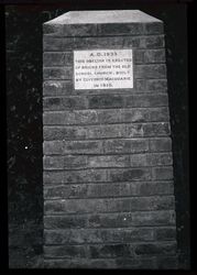 Obelisk at St Peter's Church, Richmond. Inscription on stone reads: "A.D. 1933 this obelisk is erected of bricks from the old school church built by Governor Macquarie in 1810". Digitised from a glass lantern slide.