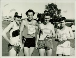 Caption: "Bible Society's run, ride row annual classic - four members of the team from St Michael's Vaucluse, Chris Puttock, Warwick Morrison, Eddie Bosch and John Newman."