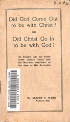 Ward, Albert P. Did God Come Out to Be with Christ? Or Did Christ Go In to Be with God? : an Inquiry Into the Truth About Christ's Entry Into the Heavenly Sanctuary At the Time of His Ascension / by Albert P. Ward. Sydney : Evangelical Book Depot. Retrieved from the Atla Digital Library, https://archives.moore.edu.au/documents/detail/199368.