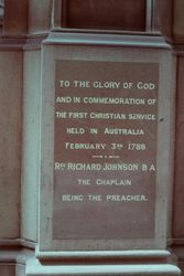 , Unidentified.First Church Memorial Tablet, 4/2/62. Church of England Historical Society (Diocese of Sydney). 1962. Retrieved from the Atla Digital Library, https://archives.moore.edu.au/documents/detail/104035.
