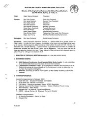 Church Women - National Executive, Australian.2004 2 National Executive Minutes February. Australian Church Women. 2004. Retrieved from the Atla Digital Library, https://archives.moore.edu.au/documents/detail/156299.