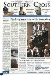Sydney mourns with America by Jeremy Halcrow Eyewitnesses to a nightmare by Jeremy Halcrow Women’s convention success may exhaust talent pool - on inaugural Katoomba Women's Convention Archbishop Jensen appoints regional bishops and registrar - on the appointment of Glenn Davies and Peter Tasker as bishops What sense can we make of this evil act? by Peter Jensen - on the American terrorist attacks Churches in the midst of the terror World leaders look to God for answers Pray for justice not revenge by Margaret Rodgers Farewell, Bishop Barnett by Evonne Paddison Volume 07 number 09 2001-10-01/2001-10-31