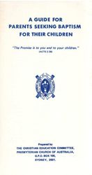 A Guide for Parents Seeking Baptism for Their Children / Presbyterian Church of Australia. Melbourne : Joint Board of Christian Education of Australia and New Zealand.. 1968. Retrieved from the Atla Digital Library, https://archives.moore.edu.au/documents/detail/205095.