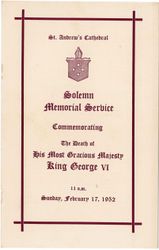 St Andrew's Cathedral (Sydney, N.S.W.).Solemn Memorial Service Commemorating the Death of His Most Gracious Majesty King George Vi Sunday February 17, 1952. St Andrew's Cathedral (Sydney, N.S.W.). 1952. Retrieved from the Atla Digital Library, https://archives.moore.edu.au/documents/detail/266762.