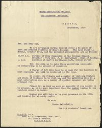 Letter inviting Jones to a reunion of past and present Moore College students to be held on the 10th October 1910, enclosing a formal invitation. Attached to the letter was the original letter to Rev. Cakebread, the organizer of the reunion, from Harts Ltd, presenting the proposed menu for the reunion luncheon.