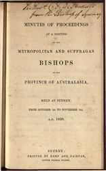 Broughton, W. (1850). Minutes of proceedings at a meeting of the Metropolitan and Suffragan Bishops of the Province of Australasia, held at Sydney, from October 1st to November 1st, A.D. 1850. Retrieved from the Atla Digital Library, https://archives.moore.edu.au/documents/detail/21198.