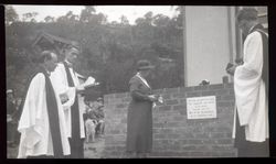 Laying of the foundation stone, extension of St Andrew's Oxford Falls, by Mrs P.W. Gledhill. Inscription on stone reads: "To the glory of God this building enlarged A.D. 1935 tablet set by Mrs P.W. Gledhill on St Andrew's Day". Digitised from a glass lantern slide.