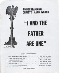 Thomas, Philip H. E.I and the Father Are One / Philip H.e. Thomas. Adelaide : Trinity Pub. Society.. Retrieved from the Atla Digital Library, https://archives.moore.edu.au/documents/detail/198887.