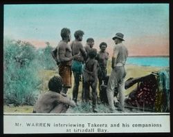 Photograph of printed image of men standing on a beach, with caption: "Peace expedition to Caledon Bay, 1934. Mr Warren interviewing Takeera and his companions at Grindall Bay". Hand-coloured. Digitised from a glass lantern slide. Aboriginal and Torres Strait Islander viewers are advised that this photograph contains images of people who have died.