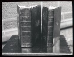 Bible and Prayer Book, standing upright on a table. Brought to Australia by Richard Johnson, kept at St Philip's Sydney. Digitised from a glass lantern slide.