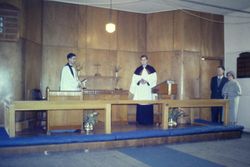 St Luke's Regents Park, after dedication of new communion rails, Rector Rev S. Horton, catechist Mr Bruce Wilson, Donor Mrs A.C. Mackay, builder mr Jim Smith of Birrong, 17/6/62