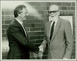 Mr Allen Barnett (R) the 80 year old son of the Rev Benson Barnett, minister of the Leichhardt Congregational Church, with one of the former pastors Rev Walter G. Coller