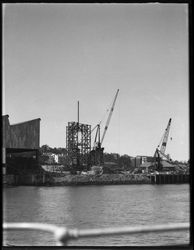 Cash, E.Workshop at Milson's Point, with cranes and beginning of construction of north approach span. Retrieved from the Atla Digital Library, https://archives.moore.edu.au/documents/detail/184011.