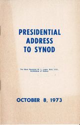 Loane, Marcus Lawrence (1911-2009). Presidential Address to Synod (province of New South Wales): October 1973 / M.l. Loane. Sydney : Ambassodor Press 1973. 1973. Retrieved from the Atla Digital Library, https://archives.moore.edu.au/documents/detail/129992.
