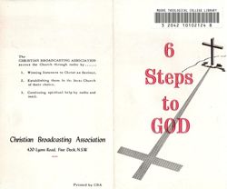 Six Steps to God/ Christian Broadcasting Corporation. Sydney: [Diocese of Sydney] [date of publication not identified]. Retrieved from the Atla Digital Library, https://archives.moore.edu.au/documents/detail/207151.